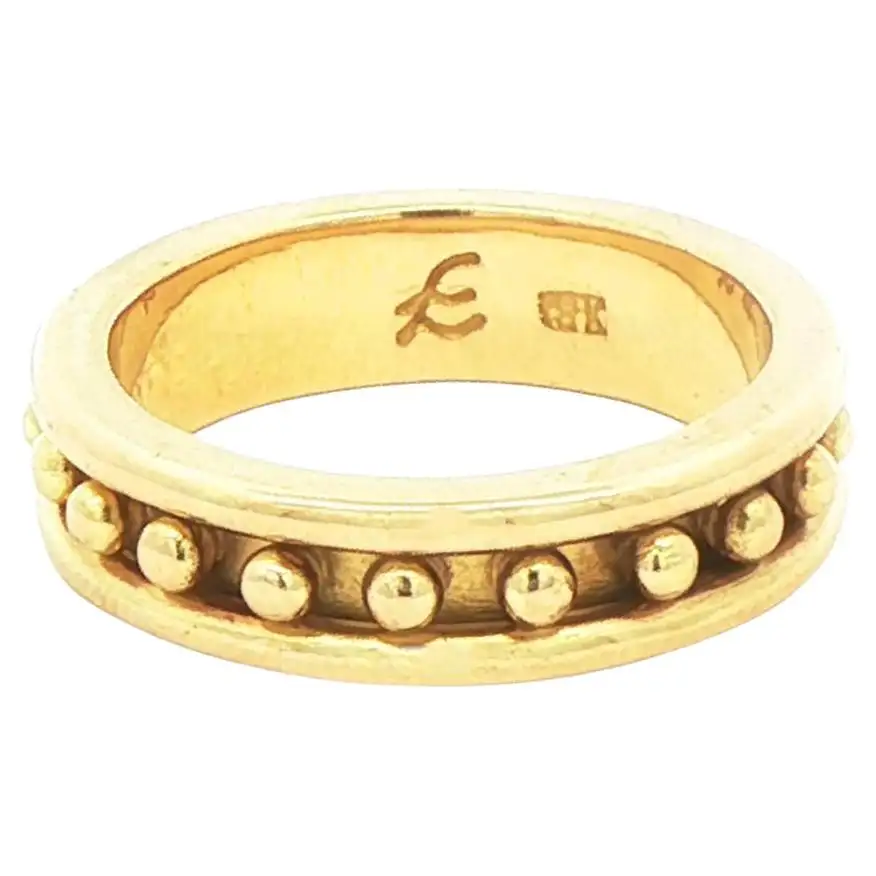 Crafted from 19kt yellow gold, the Elizabeth Locke Narrow Granulated Stack Ring showcases a 5mm band with bead motifs along the center strip. The perfect addition to any jewelry collection, this ring boasts a refined and elegant appearance. Finger size 5 weighs 6.3 grams.
