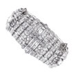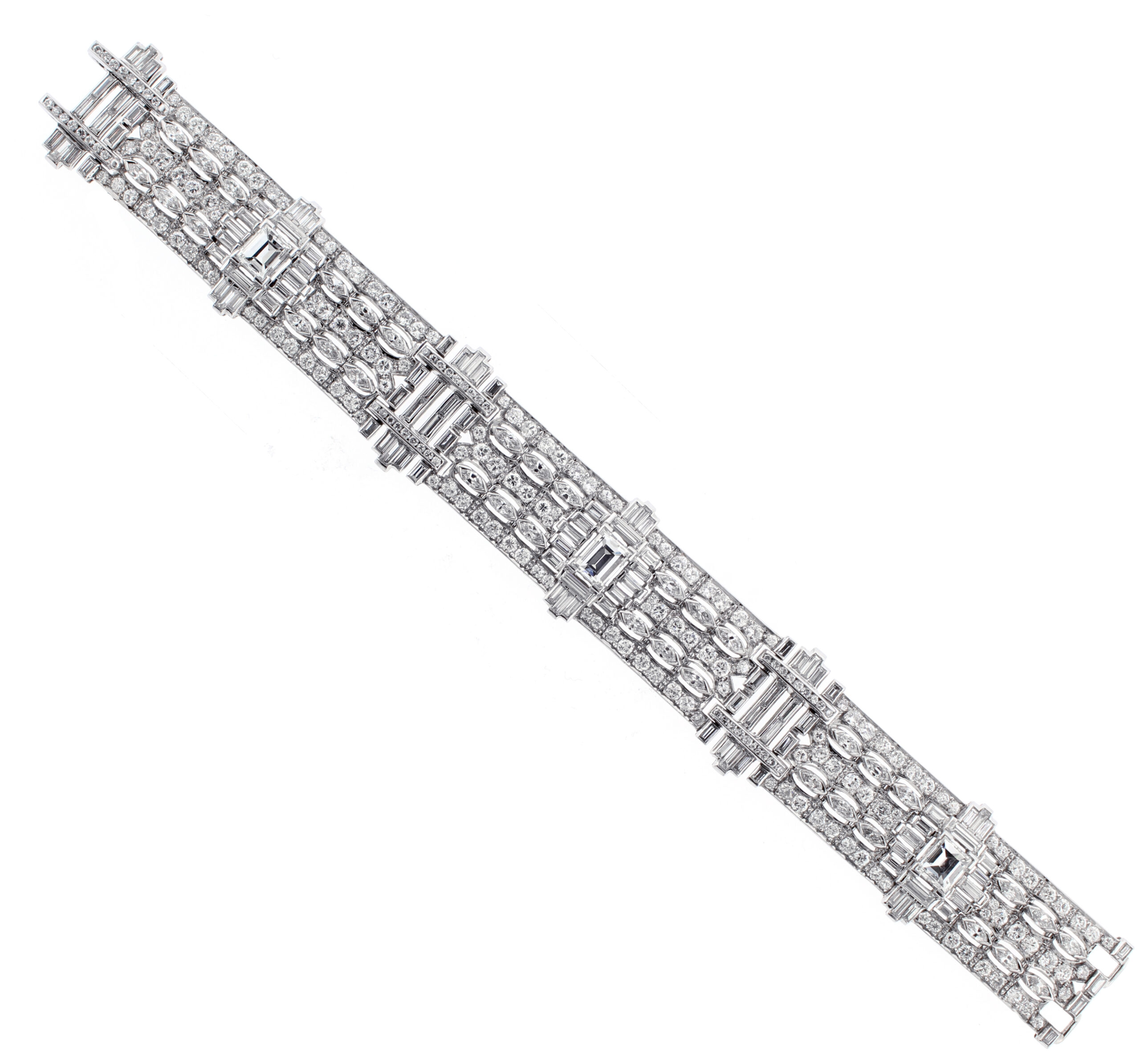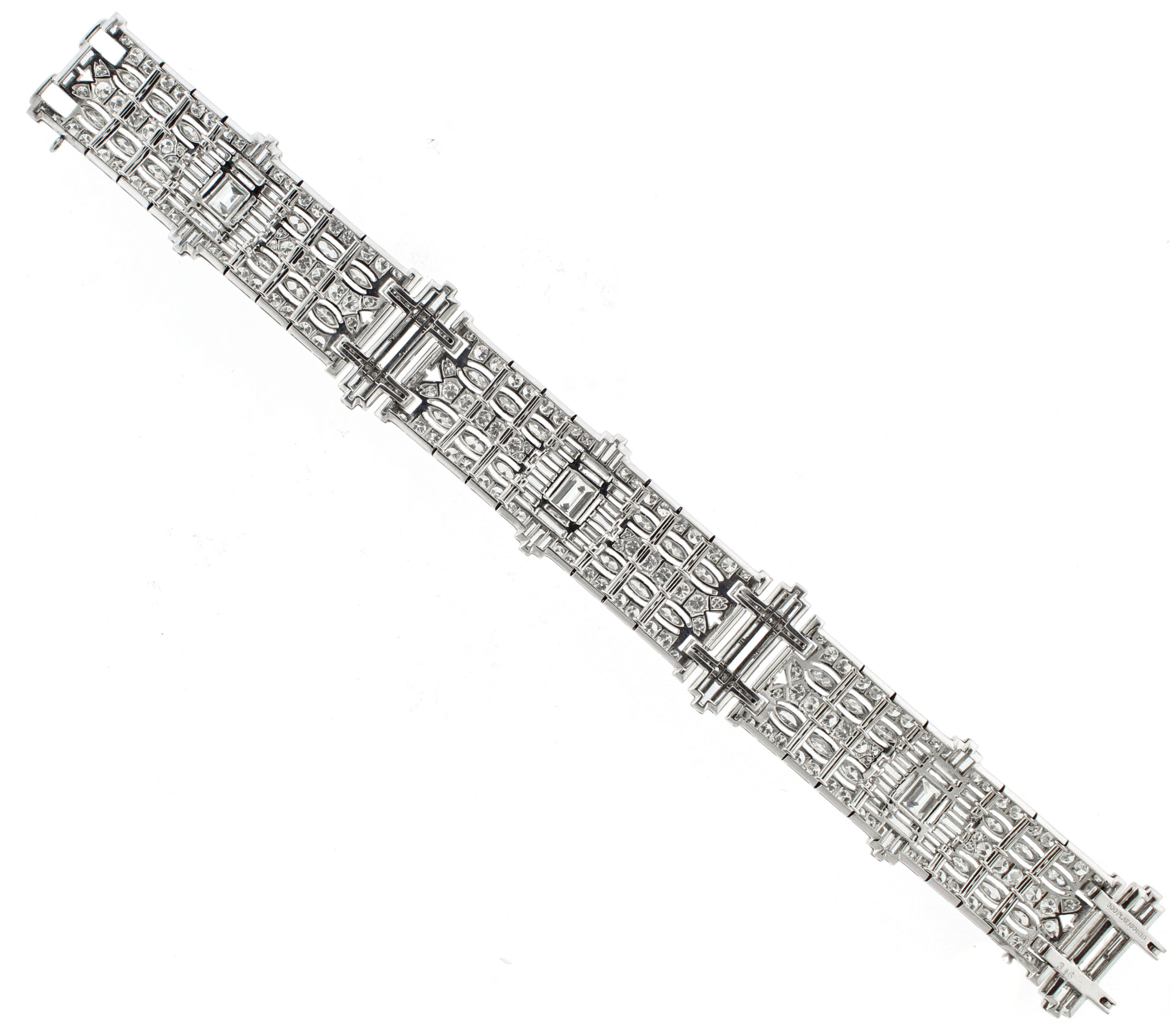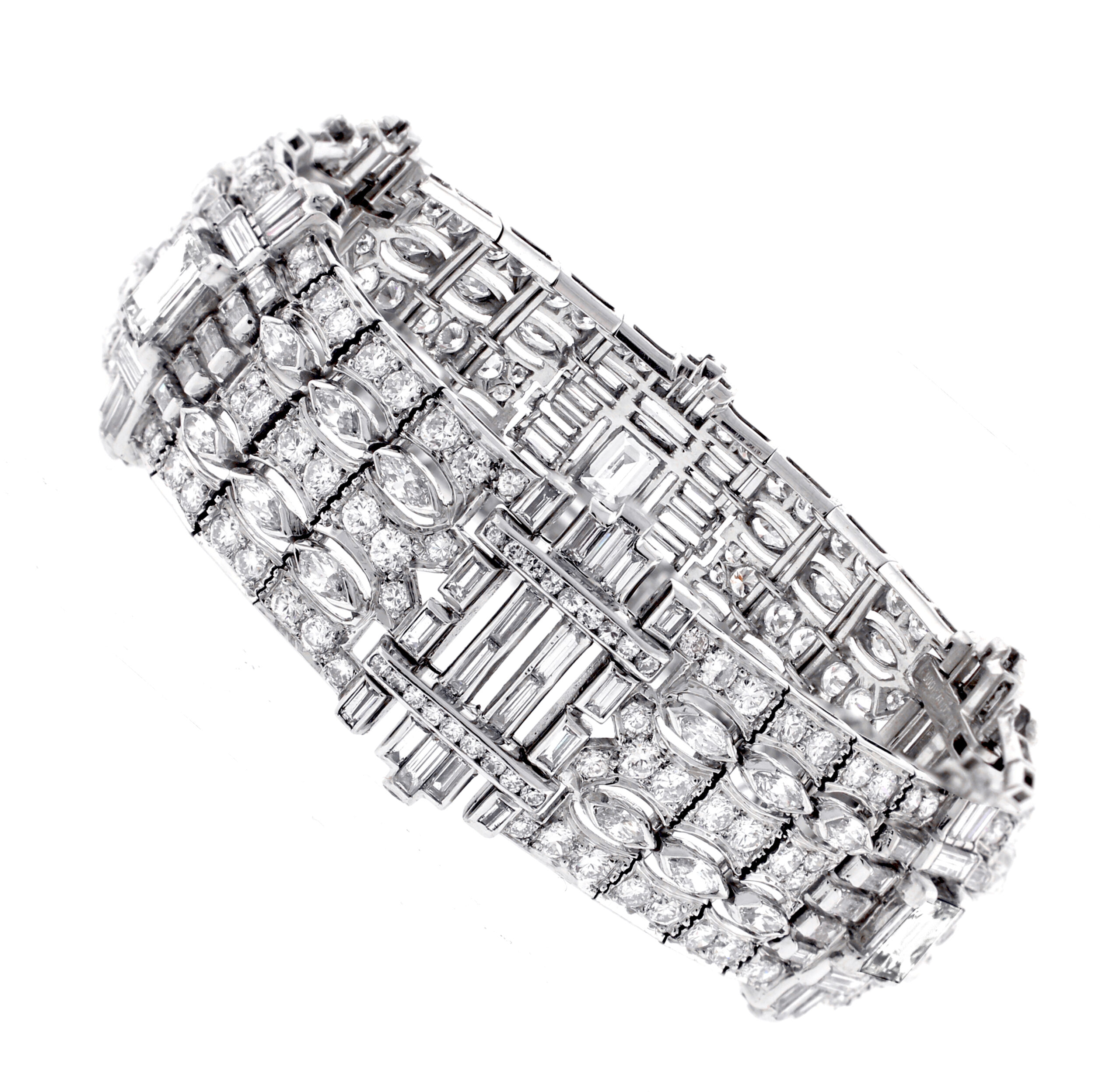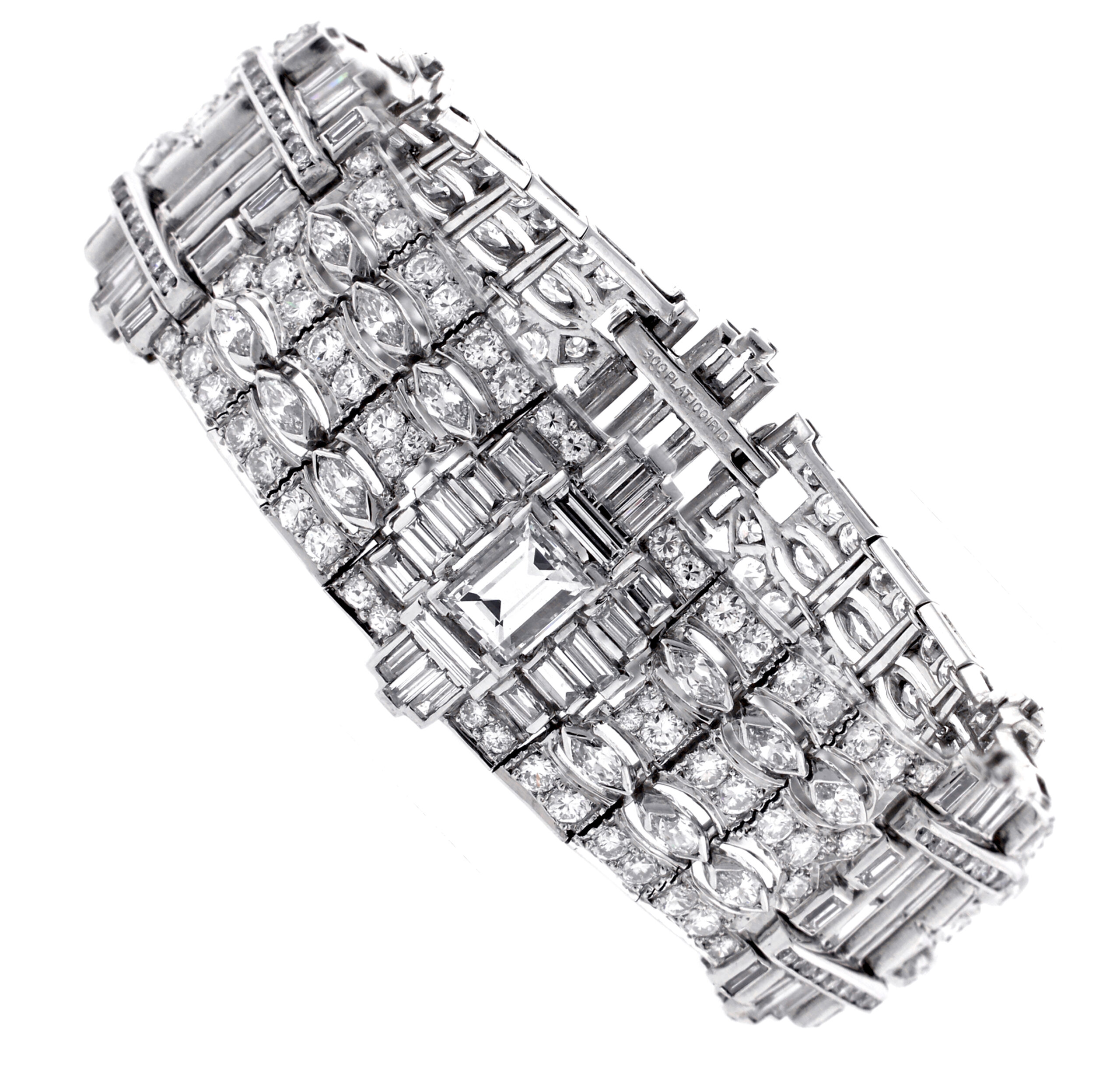 This magnificent platinum Art Deco bracelet is a true masterpiece of vintage glamour and exquisite craftsmanship. Measuring 7 inches long and 3/4 inch wide, it features a striking design of two symmetrical sections seamlessly joined to create an elegant, fluid silhouette around the wrist. Three beautifully proportioned rectangular-cut diamonds are each set prominently within the bracelet’s three main panels, lending architectural structure and timeless appeal. These exceptional stones have a combined weight of approximately 2.55 carats. They are framed by a breathtaking arrangement of 210 round brilliant-cut diamonds (approximately 9.00 carats), 108 baguette-cut diamonds (approximately 6.50 carats), and 36 marquise-cut diamonds (approximately 3.60 carats), for an impressive total diamond weight of approximately 21.65 carats. Every diamond has been meticulously selected for its superb quality and hand-set with impeccable attention to detail, showcasing the finest example of Art Deco design and craftsmanship. Bold yet refined, this bracelet is a spectacular statement piece — perfect for collectors and connoisseurs who appreciate enduring elegance and uncompromising luxur