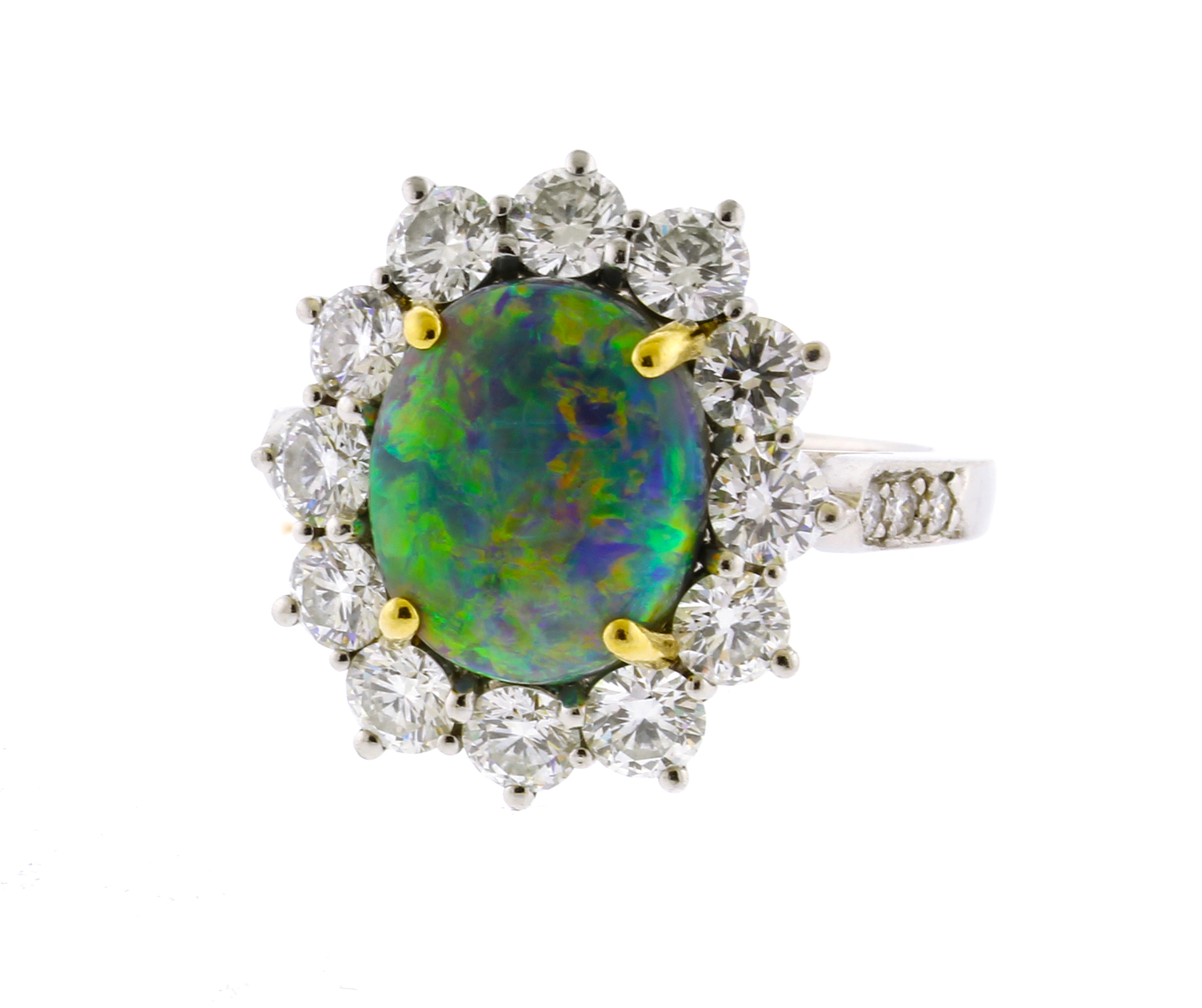 The Tiffany & Co. Black Opal and Diamond Ring features a stunning 4-carat gem black opal at its center, showcasing a vibrant play of color. It is beautifully accented by 12 round diamonds totaling approximately 3 carats. Crafted in platinum, the ring highlights the opal with 18kt yellow gold prongs for added contrast and elegance. A unique and timeless piece, this ring combines exquisite gemstones and expert craftsmanship, making it a standout addition to any jewelry collection. Signed and numbered 18400316. size 8, maybe sized upon request